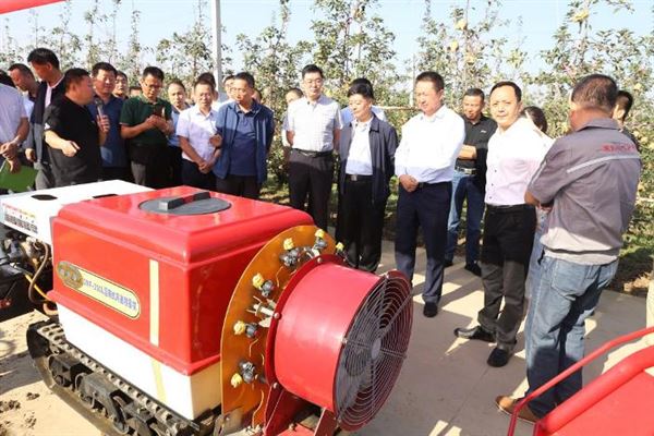 會議現(xiàn)場展示了果園開溝施肥、植保、除草、修剪套袋、采收、運(yùn)輸、防災(zāi)等9大類30余臺機(jī)具;演示了防凍煙霧發(fā)生器、開溝施肥機(jī)、避障割草機(jī)、行間割草機(jī)、遙控打藥機(jī)、果園高空作業(yè)平臺、修剪機(jī)、果園無人車等21臺新機(jī)具。