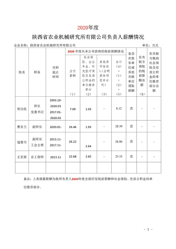 2020年度陜西省農(nóng)業(yè)機(jī)械研究所有限公司負(fù)責(zé)人薪酬情況