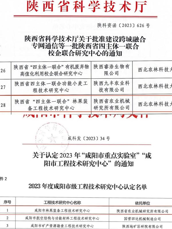 新年伊始,從陜西省科學(xué)技術(shù)廳、咸陽市科技局分別傳來喜訊,根據(jù)《陜西省工程技術(shù)研究中心管理辦法》(陜科發(fā)[2022]4號(hào))、《陜西省科技廳支持校企合作共建新型研發(fā)平臺(tái)工作指引》(陜科發(fā)[2016]11號(hào))的有關(guān)規(guī)定,省科技廳同意組建以我公司為依托,聯(lián)合西北農(nóng)林科技大學(xué)共建“陜西省‘四主體一聯(lián)合’林果裝備校企聯(lián)合研究中心”。同時(shí),市科技局根據(jù)《咸陽市工程技術(shù)研究中心認(rèn)定管理辦法》的有關(guān)規(guī)定,認(rèn)定我公司咸陽市林果裝備工程技術(shù)研究中心為“市級(jí)工程技術(shù)研究中心”。