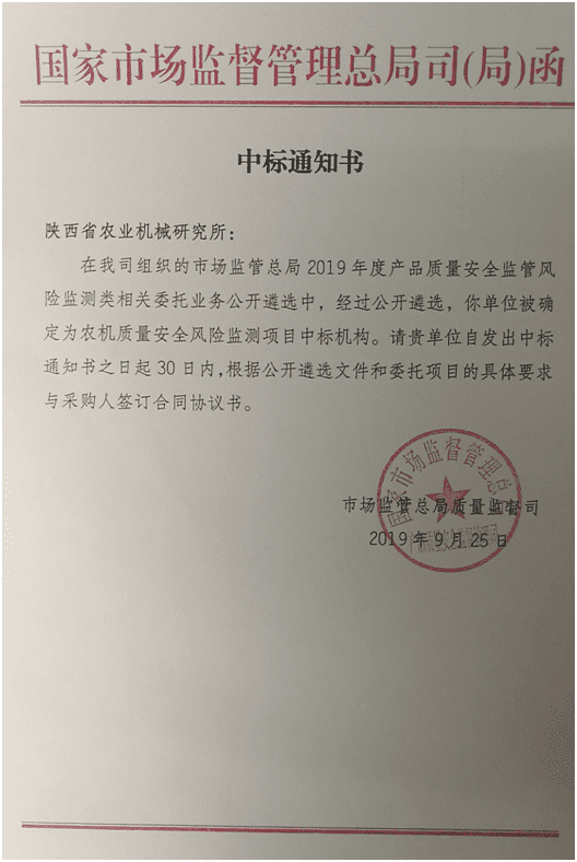 通過國家市場監(jiān)管總局質(zhì)量監(jiān)督司2019年度產(chǎn)品質(zhì)量安全監(jiān)管風(fēng)險(xiǎn)監(jiān)測(cè)類相關(guān)委托業(yè)務(wù)公開遴選,陜西省農(nóng)業(yè)機(jī)械研究所(陜西省農(nóng)業(yè)機(jī)械產(chǎn)品質(zhì)量監(jiān)督檢測(cè)總站)成功中標(biāo),成為全國農(nóng)機(jī)產(chǎn)品質(zhì)量安全風(fēng)險(xiǎn)監(jiān)測(cè)項(xiàng)目承檢機(jī)構(gòu)。這是我所繼成功中標(biāo)國家級(jí)產(chǎn)品質(zhì)量監(jiān)督抽查任務(wù)之后的又一重大喜訊!