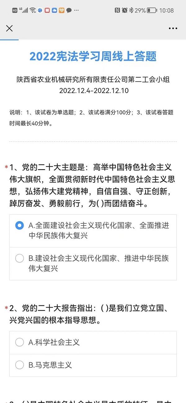 活動(dòng)以線上線下相結(jié)合的形式進(jìn)行。線下學(xué)習(xí)結(jié)合工作實(shí)際,組織小組全體會(huì)員集中學(xué)習(xí)憲法內(nèi)容,宣傳憲法精神;線上答題以學(xué)習(xí)貫徹二十大精神,推動(dòng)全面貫徹實(shí)施憲法為重點(diǎn),進(jìn)行答題考核,本小組全體會(huì)員參加。